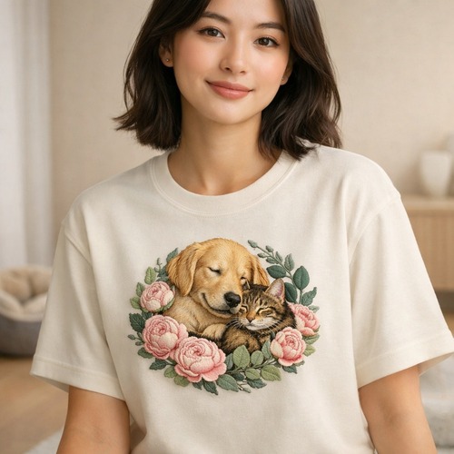 <p style="text-align: center;"><em>Premium tee with embroidered dog and cat floral wreath</em></p>
